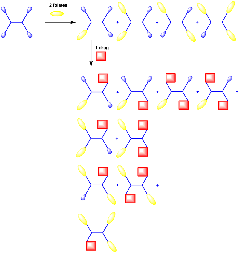 Fig. 1. A schematic representation of a dendrimer with 2 folates conjugation followed by a drug conjugation. The conjugations generate a mixture of products.